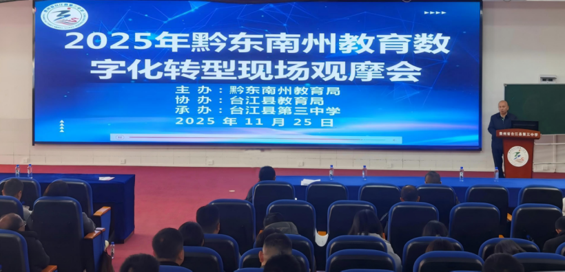 2025年11月25日,全州教育数智化转型现场观摩会在台江县第三中学召开。会议围绕“数智赋能、教研共进、转型提质”主题,现场观摩了台江县第三中学集体备课、示范课展示、AI课堂数据分析、教师互动点评等环节内容。全州各县(市)教育局分管领导、教研员、校长及骨干教师共100余人参加本次观摩会。